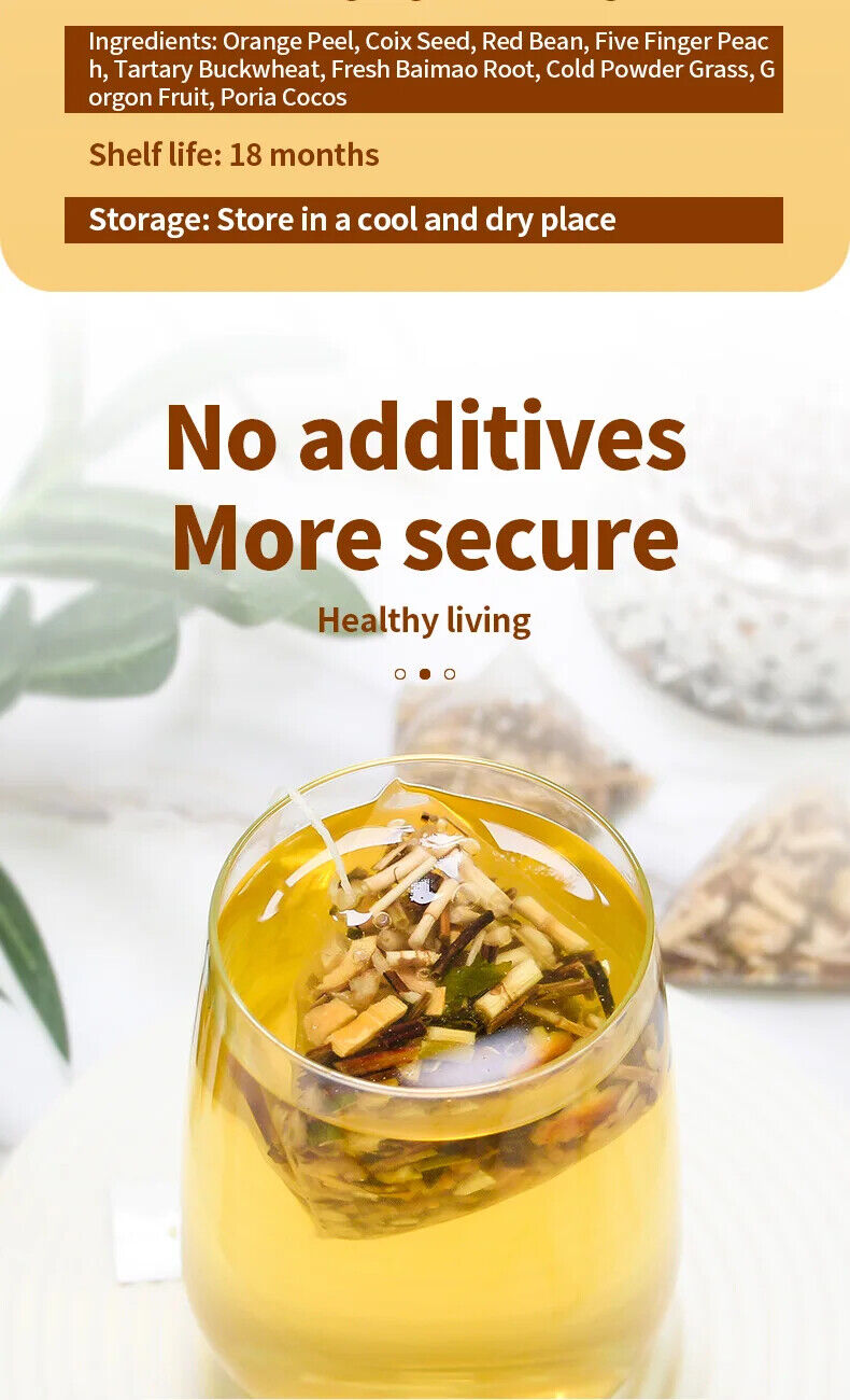 Ingredients: Orange Peel, Coix Seed, Red Bean, Five Finger Peac h, Tartary Buckwheat, Fresh Baimao Root, Cold Powder Grass, G