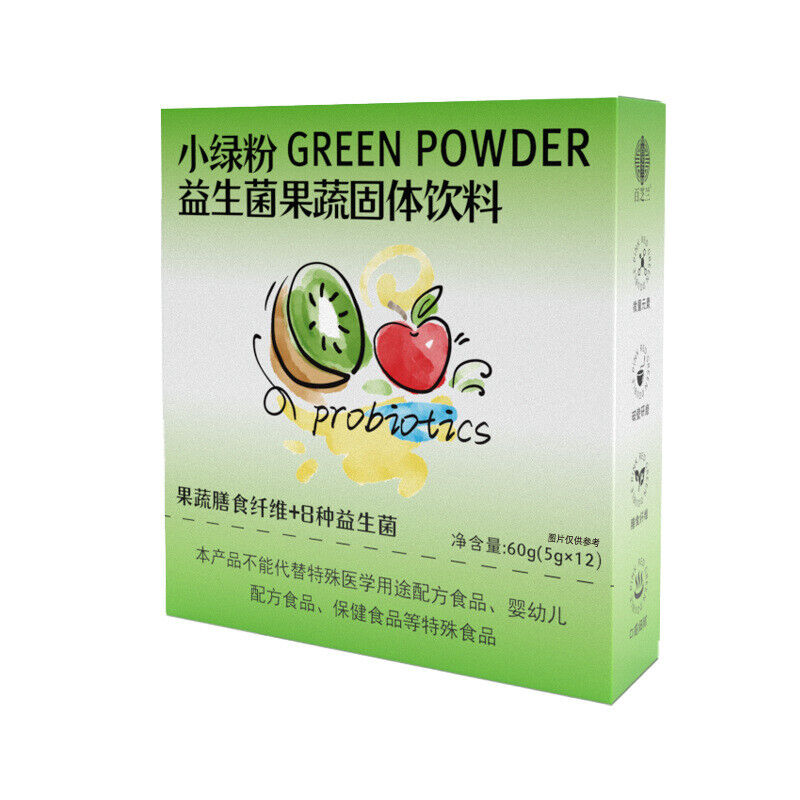 Item No.: Small green powder probiotic fruit and vegetable solid drink Product Category:Probiotics fruit and vegetable powder Raw materials and ingredients: vegetable powder, probiotics, inulin, polydextrose, apple powder, kiwi powder, selling form: packaging Storage condition: room temperature Shelf life: 24 months Product Standard No.:GB/T 29602 Storage Method:Keep in cool and...