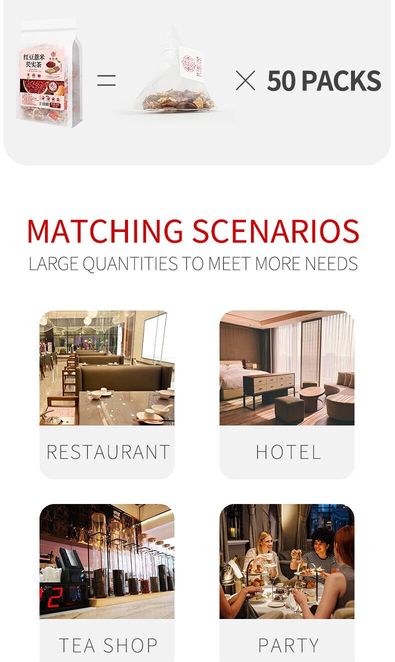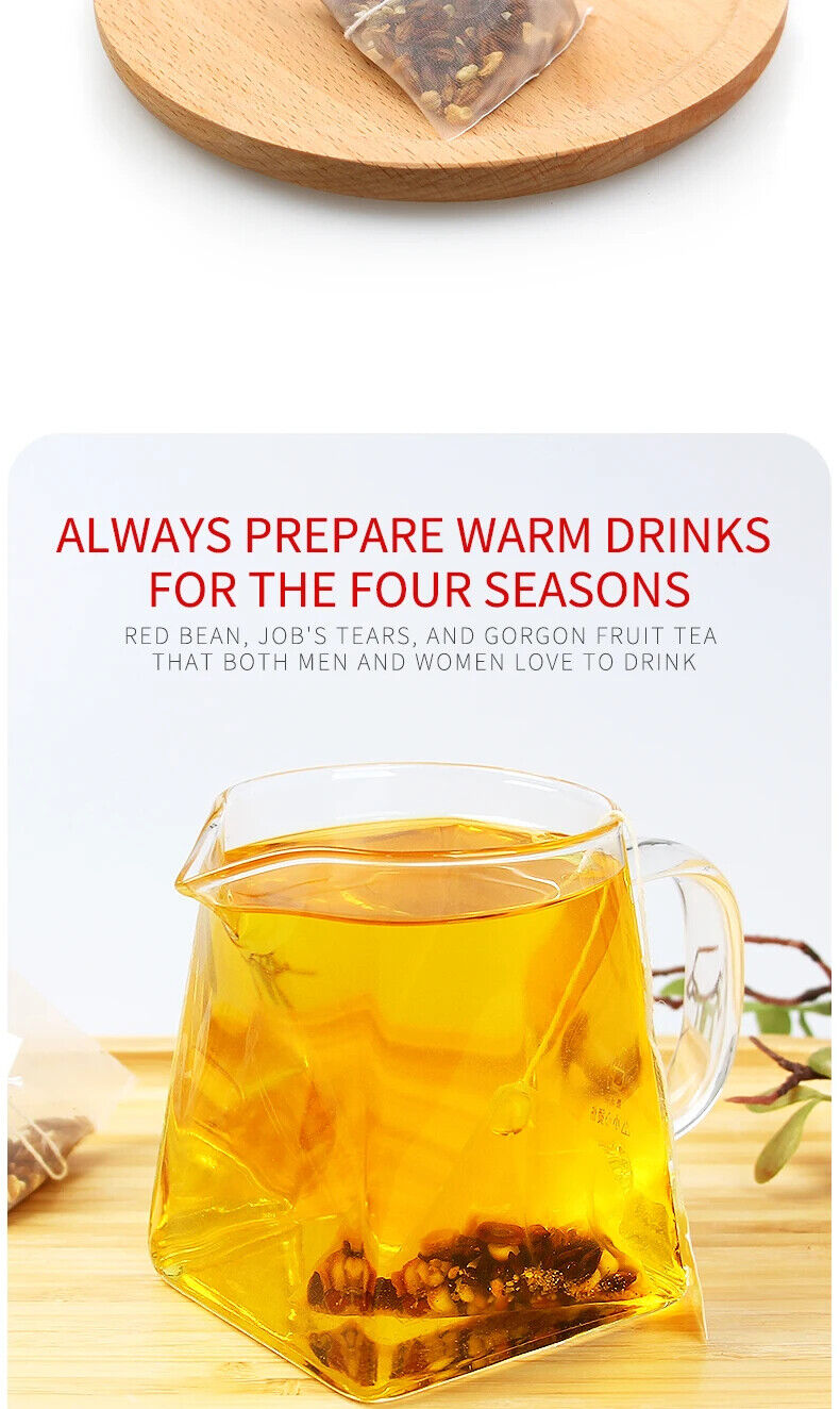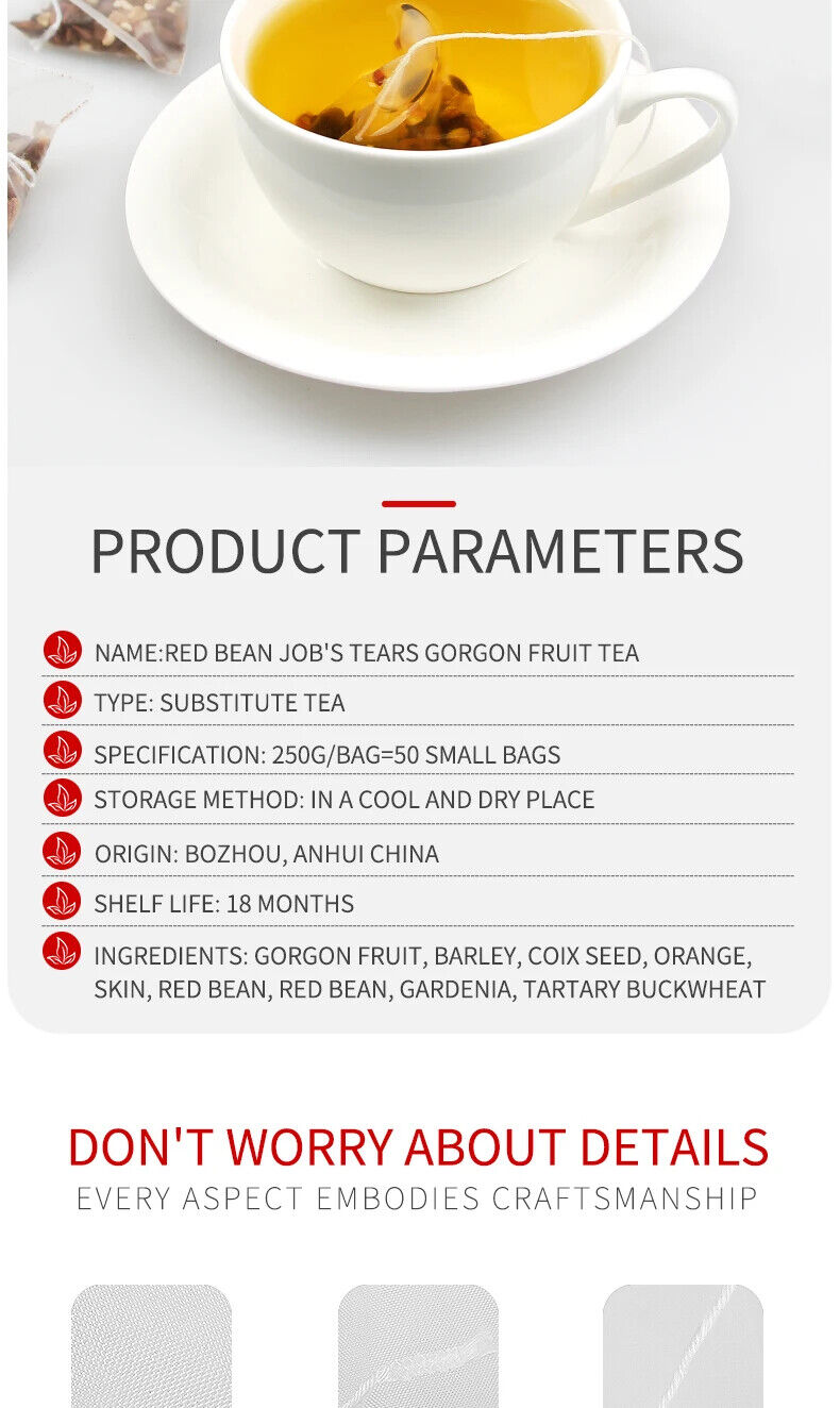 Name:Red bean Job's Tears Gorgon fruit Tea Type: substitute tea Specification: 250g/bag=50 small bags Ingredients: Gorgon fruit, barley, coix seed, orange, Skin, red bean, red bean, gardenia, tartary buckwheat Shelf life: 18 months This product adopts a triangular tea bag design, which can prevent tea ingredients from entering the mouth...