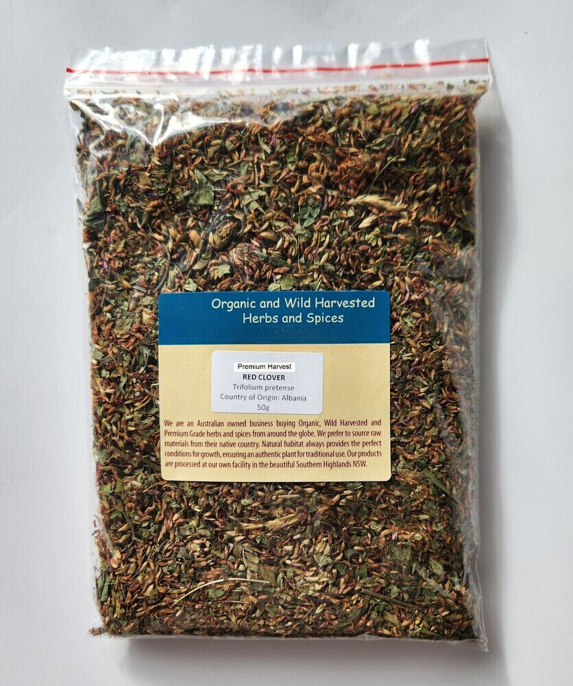 RED CLOVER FLOWER PREMIUM HARVEST HERBAL TEA 50g Trifolium pratense Red clover has metabolic diuretic (stimulates the removal of waste and water from the kidneys), lymphatic (stimulates lymph movement) and expectorant (supports elimination of mucus from the lungs) properties. Because of these characteristics, red clover has been described as a 'blood purifier' or 'alterative'. Red clover is also a rich source of nutrients, and phytoestrogens known as isoflavones (such as biochanin, formononetin, daidzein, and genistein). These isoflavones have been a focus of intense research in the area of menopause and 'hormonal balancing'.Red clover has a longstanding traditional use as a medicine for tumours, mastitis, joint disorders, asthma, bronchitis, psoriasis and eczema. It was included in many traditional formulas, including the Hoxey formula. Country of Origin: Albania