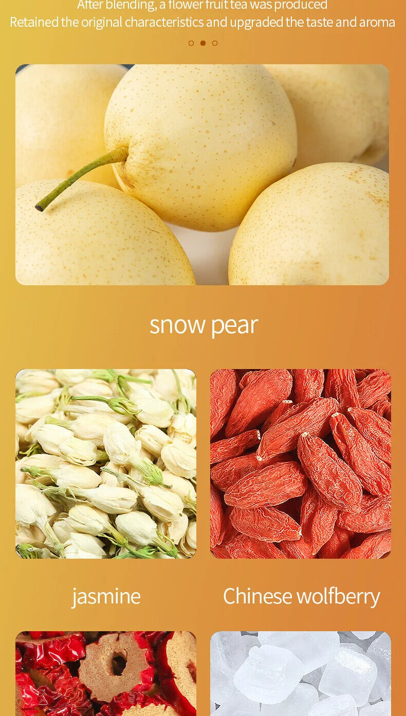 Ingredients: rock sugar, red dates, dried snow pear, medlar, Jasminum sambac
