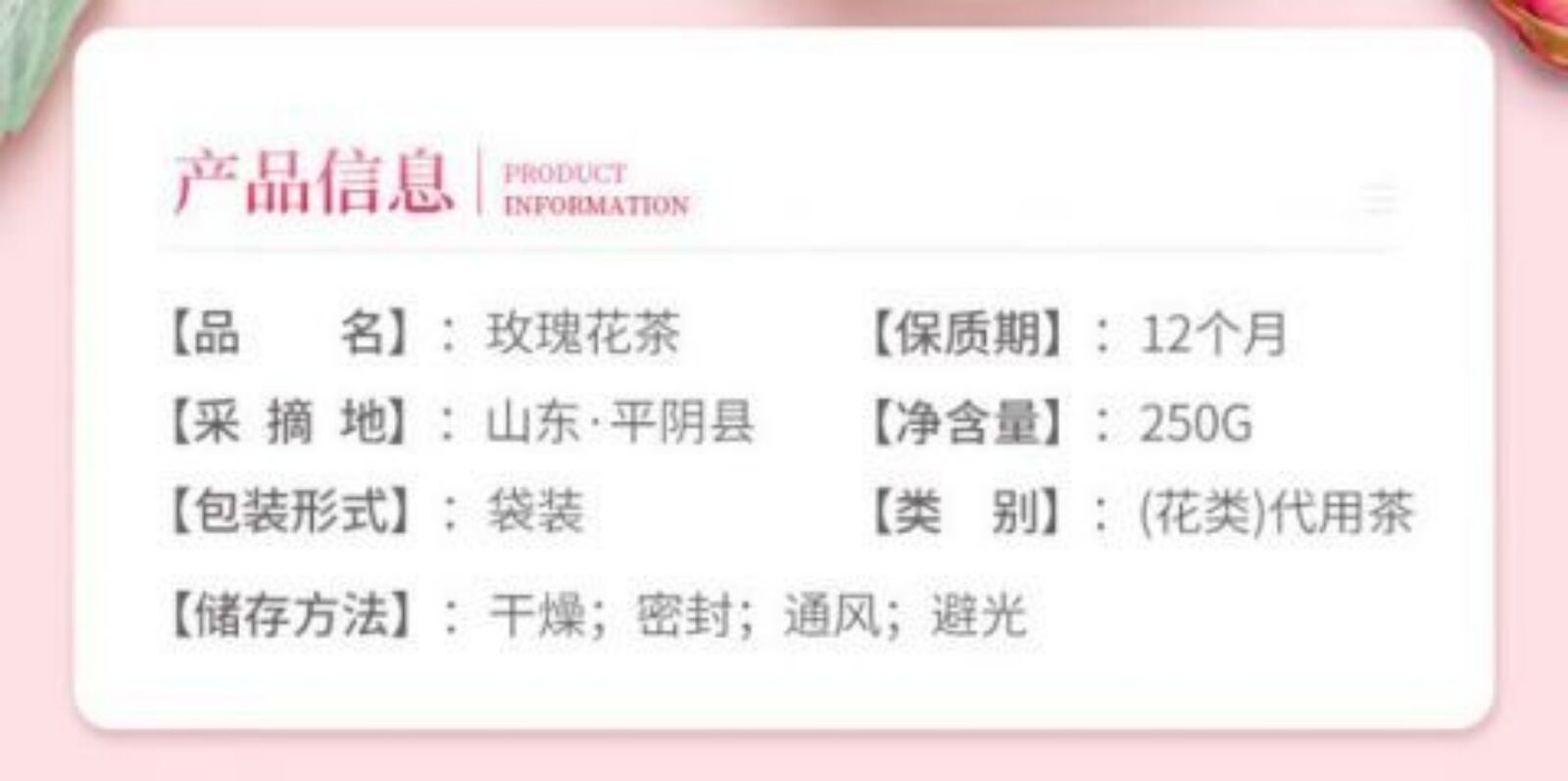 Packaging: bagged tea type: rose tea Net content: 250g Origin: Mainland China / Shandong Province / Jinan City Shelf life: 365 days Food Production License No.: SC11435052404129 Product Standard No.: GH/T1091