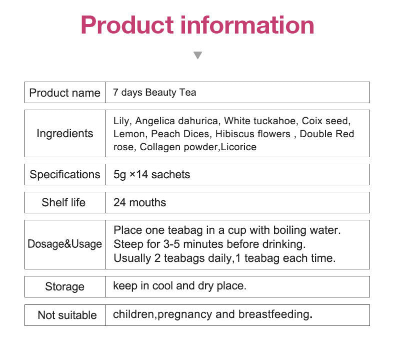 Name 7 days Beauty Tea(5g * 14 bag ) Ingredients Lily,Angelica dahurica white tuckahoe, Coix Seed, Lemon,Peach Dices. Hibiscus Flowers, Double Red Rose,collagen powder, Licorice . Function 1.Clear,glow Skin 2.Refresh And Nourish Your Skin From The inside And Outside 3.Improve Your Skin Complexion And Booster For Both Day And Evening...