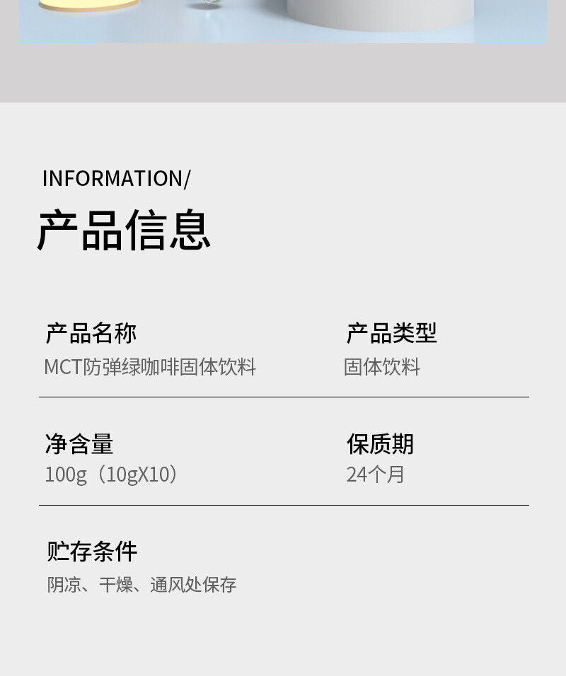 Applicable scene: home Selling method: packaging Raw materials and ingredients: white kidney beans, coffee powder, barley wakame green juice, etc. Storage conditions: room temperature Shelf life: 24 months Product standard number: see packaging Production date:see package Production Licence Number:SC11341019200073 Packing specification:10g*10bag/box Coffee Type:Bulletproof Coffee Flavour:Original Net content (specifications): 100g Sugar...