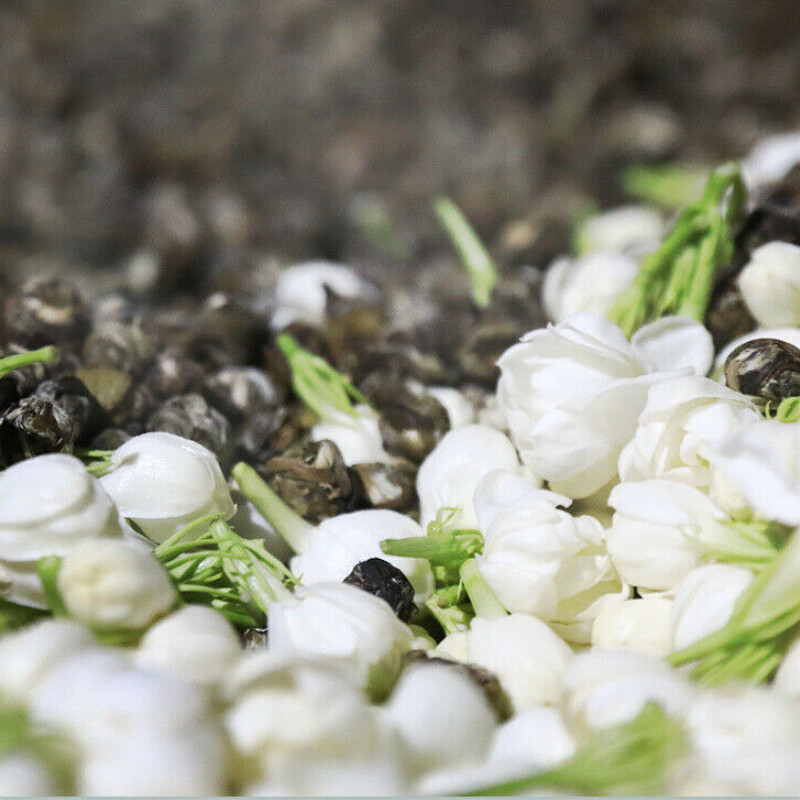 The most popular of all scented teas, Pearl jasmine are created by rolling specially plucked long downy shoots into little silvery “pearls” which are naturally scented multiple times with fresh, aromatic jasmine flowers. Pearl jasmine tea is named after the pearl like shape of the tea. Each small pearl is hand rolled. The tea is made by laying fresh jasmine petals atop the tea leaves, then tea leaves atop more petals, and so on. Up to six layers of blossoms alternating with tea leaves are used to create the highest- quality jasmines, using flowers picked at their aromatic peak. When the jasmine scent is fully merged with the leaves, the petals are removed, and the tea carefully dried again. Each pearl blosoms when added to water. This stunning tea has an intense flavour and the beautiful aroma of jasmine.