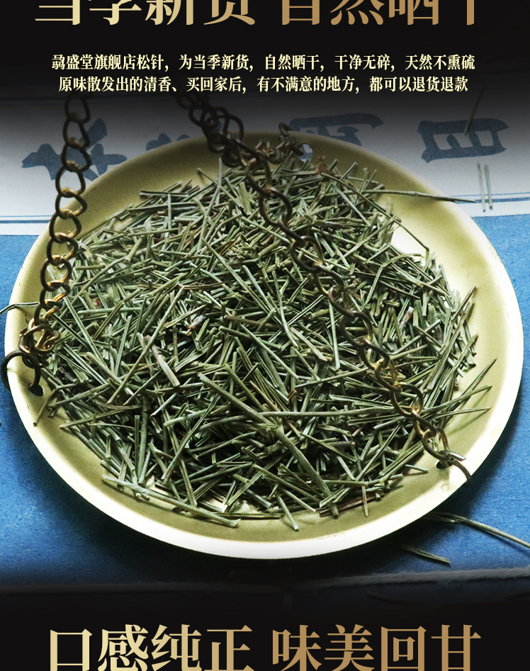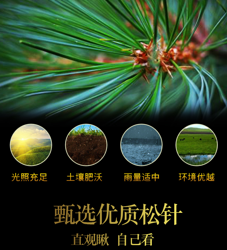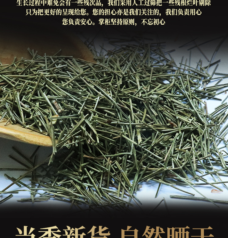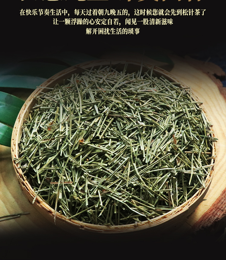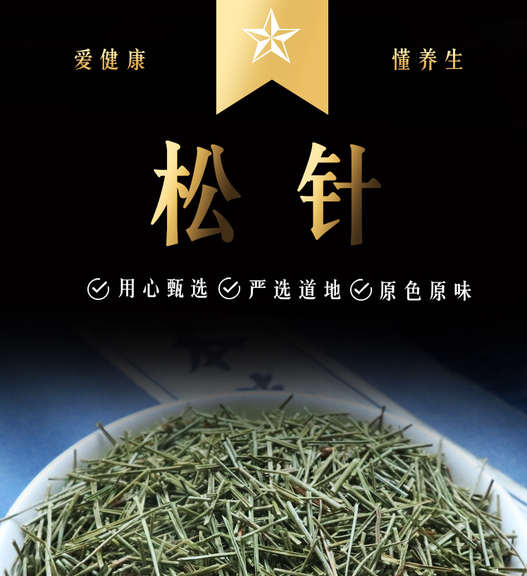 [name]:Changbai Mountain wild pine needle tea [origin]: Changbai Mountain origin shipped [weight]: 250g / Bao [shelf life]:12 months [preservation]:Low temperature, light and damp proof, best refrigerator in hot weather "Compendium of Materia Medica" records: pine needles for long-term use, an five internal organs, hairy, cold heat, resistance and keep exposed to wind and rain, mud sickness. However, in addition to the evil, the evil Qi away and the disease is not born, to obtain the effectiveness of disease sickness. Taking the spleen and kidney for a long time to nourish the lung, the spleen of the four seasons is not affected by the evil".