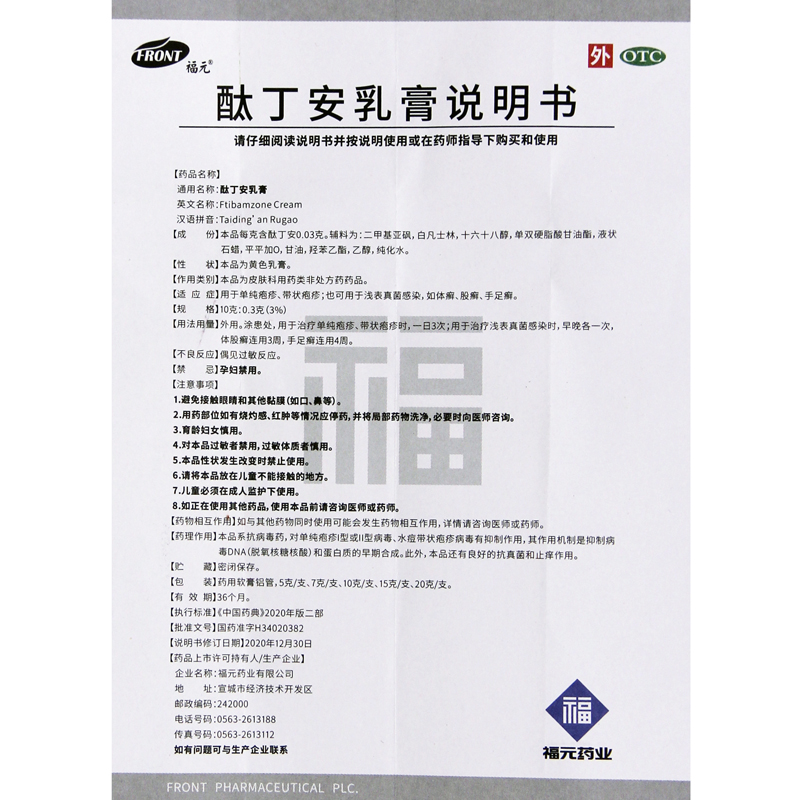 Fuyuan Phthalide Cream 7g*1pcs/box Herpes Simplex Herpes Zoster Superficial Fungal Infection OTC 福元 酞丁安乳膏 7g*1支/盒单纯疱疹 带状疱疹 浅表真菌感染 OTC