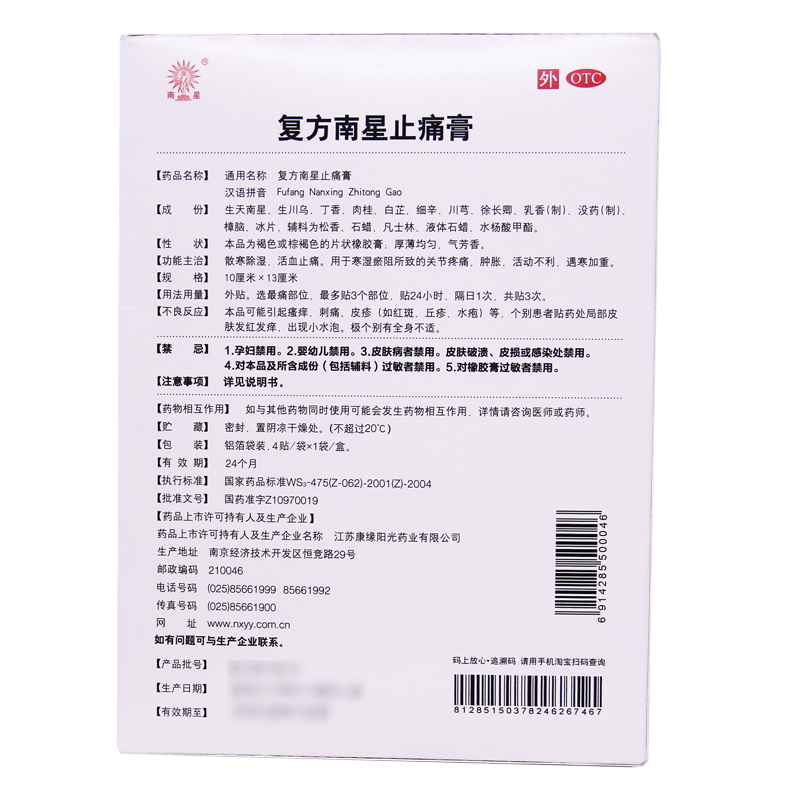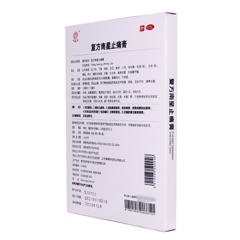 Kang Yuan Compound Southern Star Pain Relieving Cream 4 Paste/box Blood circulation and pain relief Joint pain Swelling OTC 康缘 复方南星止痛膏 4贴/盒活血止痛 关节疼痛 肿胀 OTC