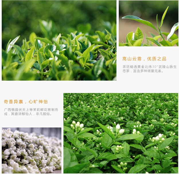 Jasmine tea has been considered as the ?the most fragrant in the world? or ?smell of the spring?, and is among Chinese Premium famous teas. This kind of Jasmine tea is the supreme, which has the tighten thin lines, oily color, fresh long-lasting fragrance, pure refreshing taste, bright yellow juice, can relax our mind and improve our work efficiency, remove the speckles, good for slimming. So it has been adored by female.