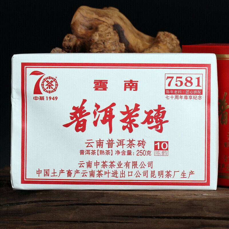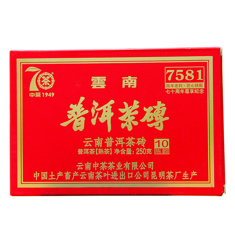 This is classic ripe puerh tea 7581 made by CHINATEA COFCO in a brick form to commemorate the founding of the company and the People's Republic of China since 1949.  This commemorative tea brick is made with 10-year aged tea and special package design to celebrate the 70th Anniversary.  2020中茶7581纪念版250克 砖
