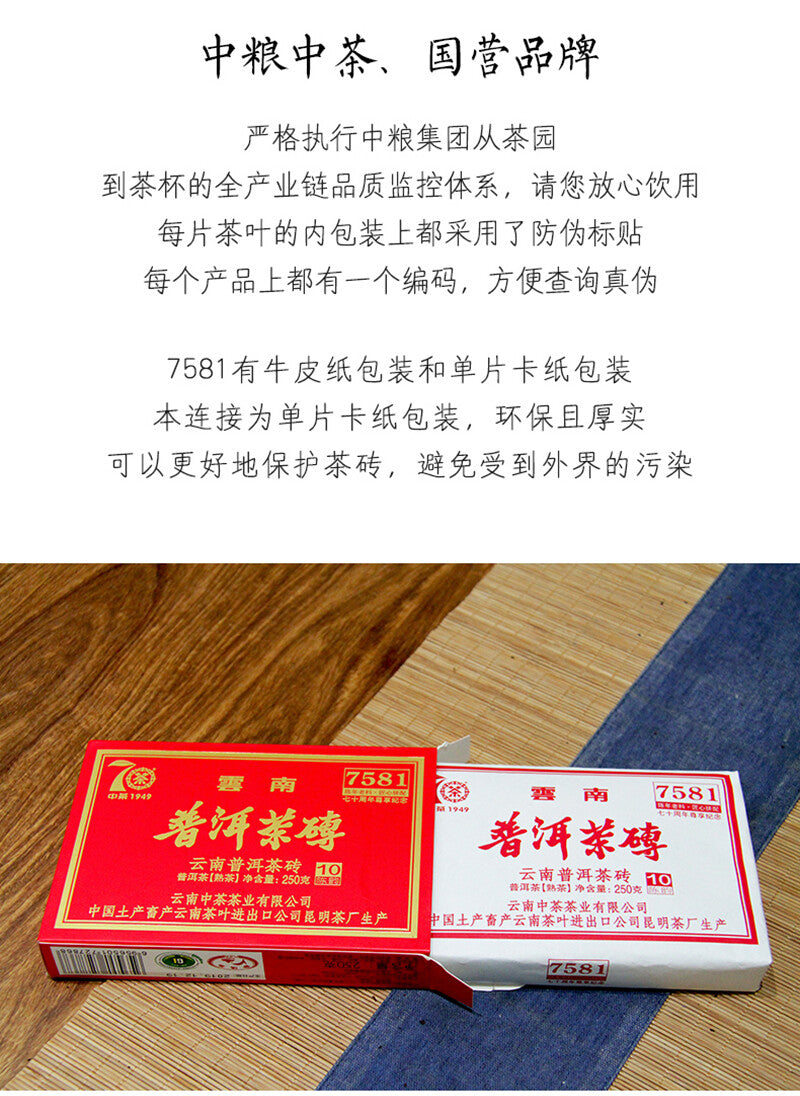 The tea brick weights 250 grams in a form of rectangle shape. The meaning of 7581: "75" represents the year number of tea bricks produced in 1975; "8" represents 8 grade tea-based blending production; "1" represents Kunming tea factory. Please note that each piece of tea has an anti-counterfeiting label on the inner packaging, and each product has a code that can be scanned to check the authenticity online.