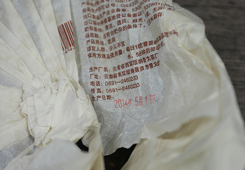 Manufacturer: Yunnan Xishuangbanna Puwen Tea Factory Net weight: 400g / Pc Production date: 2014 Origin: Yunnan, China Storage: Ventilation, cool, dry, no odor, long-term preservation in a pollution-free environment. Raw materials: Yunnan large-leaf tea raw materials