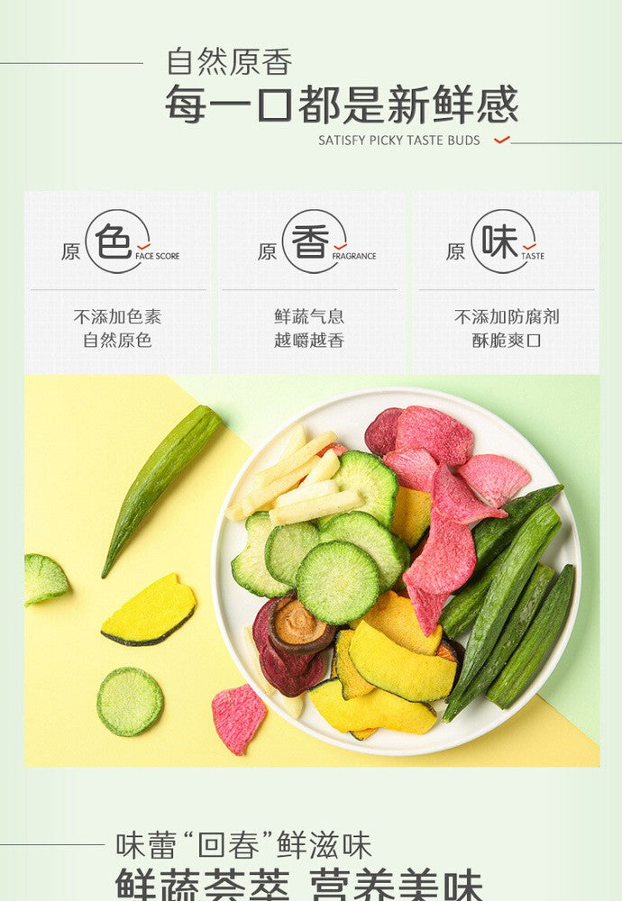 Shelf life: 270 days Ingredients: carrots, potatoes, purple potato chips, mushrooms, okra, green radish, pumpkin slices Production date: see packaging Storage method: cool and dry Net content: 50g * 2 bag Manufacturing process: air drying/drying Package specification: 2 bags/100g