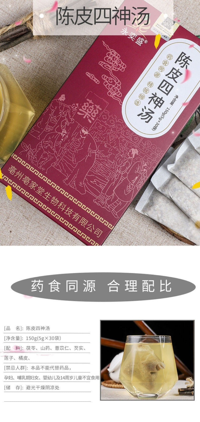 品牌:永奕盛 货号:永奕盛陈皮四神汤 适用场景:家用 售卖方式:包装 热卖月份:全年 原料与配料:茯苓、山药、薏苡仁、芡实、莲子、橘皮、 产品认证:否 储存条件:常温 保质期:12个月以上 原产地:安徽 净度:99 产品标准号:Q/BJT 0002S-2020 储藏方法:防潮防虫 是否礼盒装:否 生产日期:随时更新 生产厂家:亳州亳家堂生物科技有限公司 生产许可证编号:SC11434161107379 包装规格:5g*30包 是否为预包装食品:是 商品条形码:见包装 净含量(规格):150 是否进口:否 茶种类:袋泡茶 In case you want to order any other product, please contact us. Note:- Company may change packaging, we will send latest packaging available of...