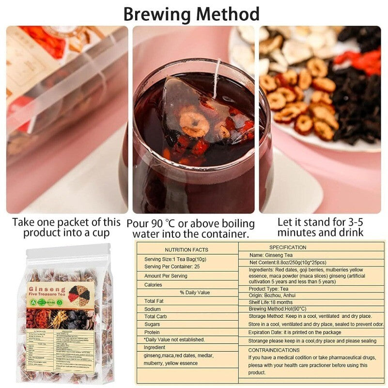 Ginseng Five Treasure Tea - Kidney Support, Red Date Herbal Blend,