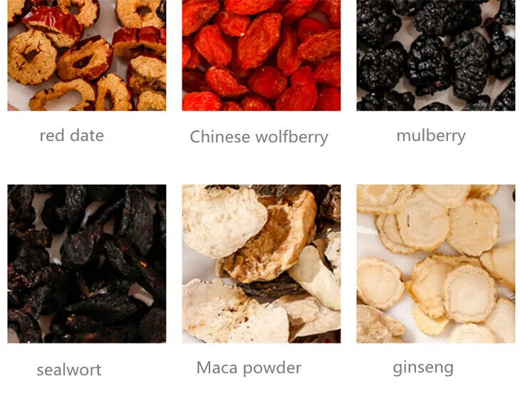 Ginseng, goji berries, mulberries, red dates, Huangjing, maca powder