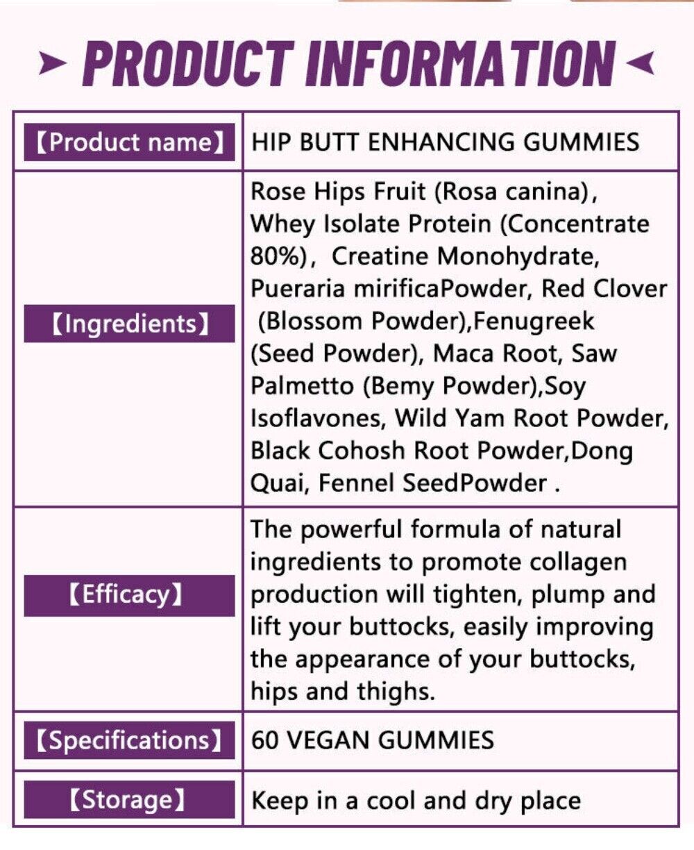 Hip Butt Enhancement Gummies 60 Caps Natural Booty Growth Supplement