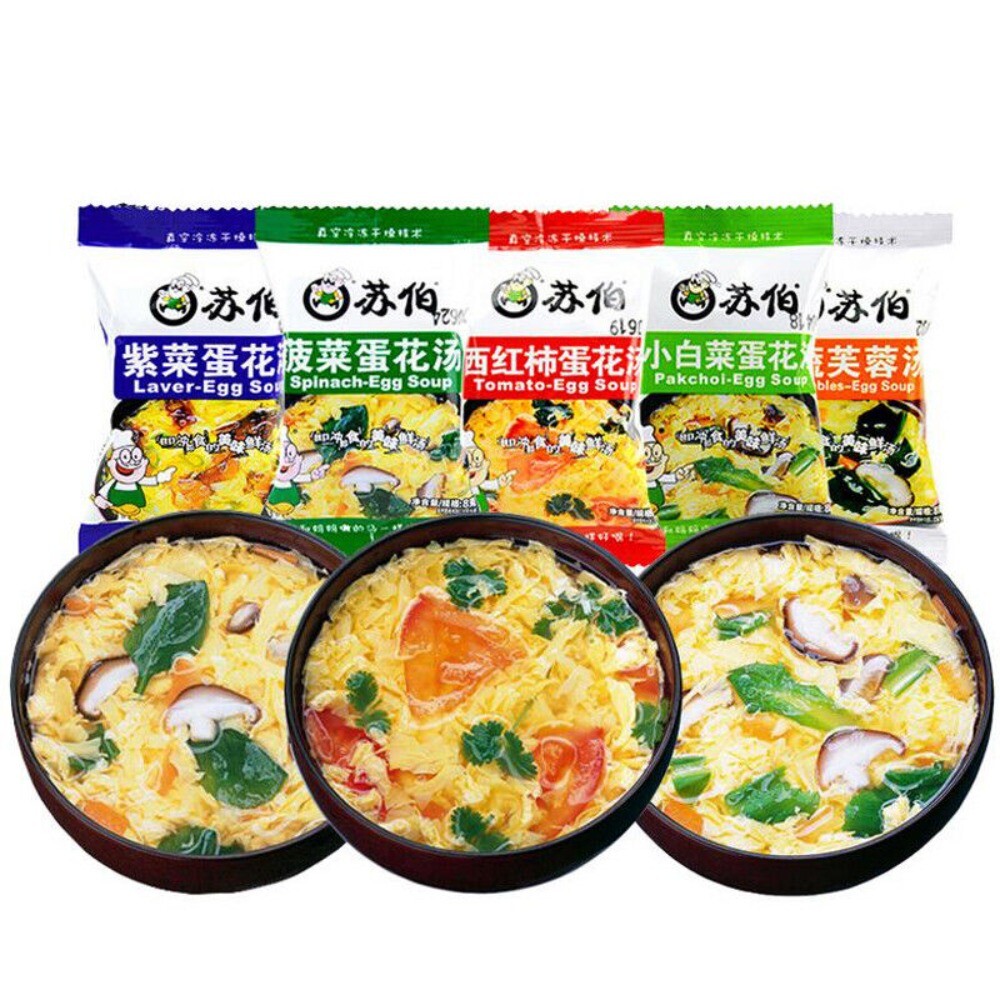Description: Ingredients: 1, spinach Egg & vegetable soup: egg, spinach, carrots, letinous edodes, salt, carrot, maltodextrin, chicken powder seasoning, sugar, starch, spices 2, tomato Egg & vegetable soup: tomatoes, egg, maltodextrin, coriander, salt, chicken powder seasoning, sugar 3, Chinese cabbage Egg & vegetable soup: egg, cabbage, carrots, letinous edodes, salt,...