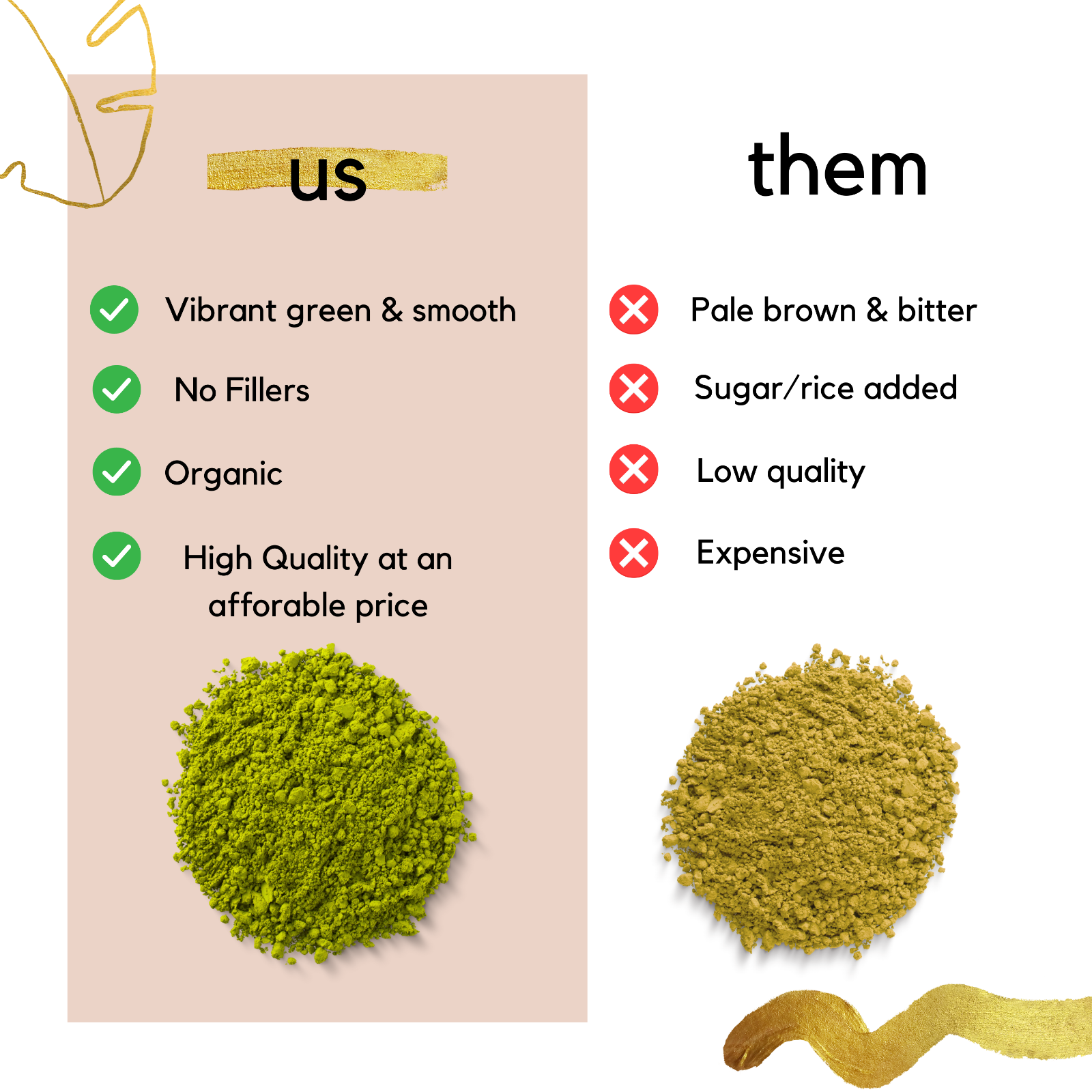 - Premium Latte-Grade quality matcha tea for delicious, nutrient-rich lattes, smoothies, and more! - Easily mix, whisk or blend to make delicious matcha recipes - 100% USDA Organic Certified - Ideal coffee and energy drink alternative source of caffeine without the jitters or afternoon crash - Diet friendly with absolutely no fillers or sweeteners (Vegan, Raw, Keto, Gluten Free, Paleo Friendly) HEALTH BENEFITS OF MATCHA GREEN TEA Matcha vs. Regular Green Tea - One cup of Matcha is packed with more antioxidants than 10 cups of regular green tea. Boost Your Metabolism - Matcha contains polyphenol EGCG which is linked to fat burning and weight loss support when combined with moderate exercise and healthy diet. Calming Zen Effect - You'll feel calmer, more focused, and experience better moods due to the amino acid L-theanine which promotes alert relaxation Increase Energy and Focus - Matcha is an all-natural source of caffeine |