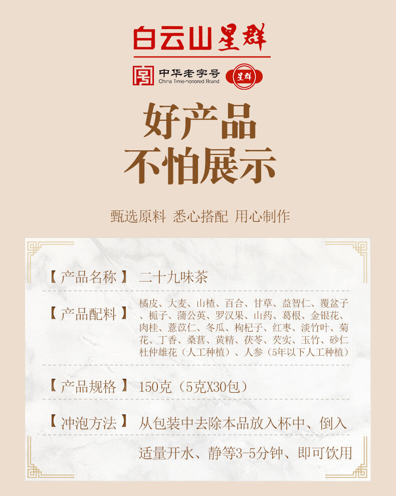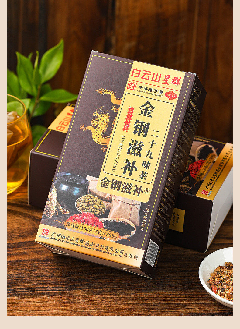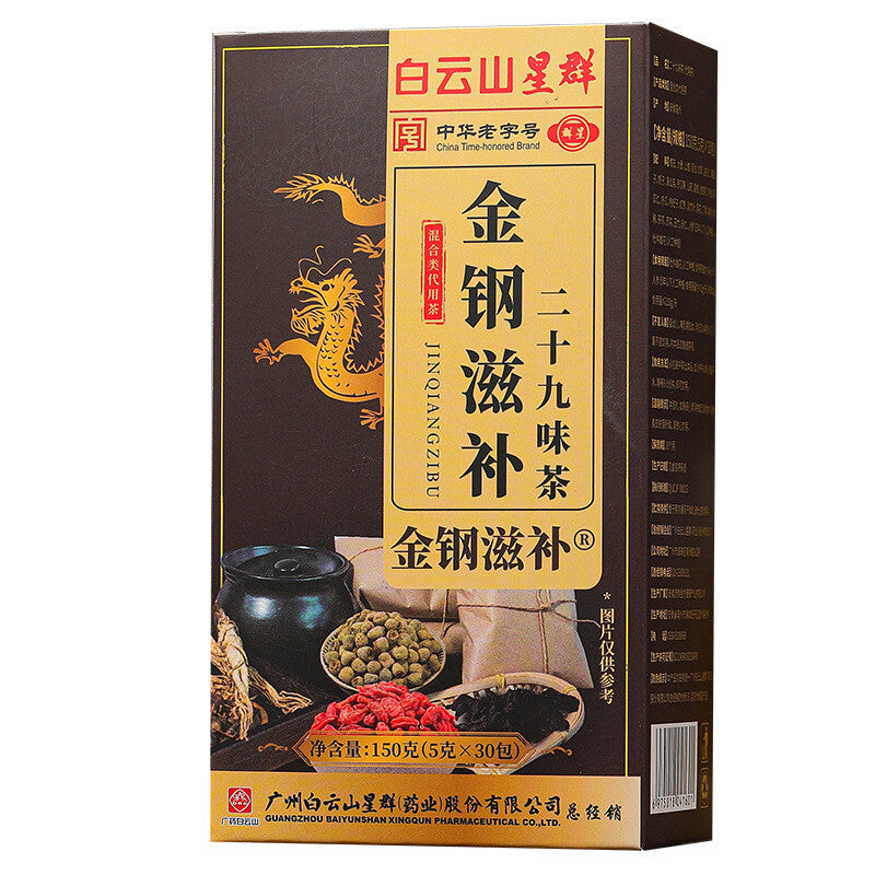 品牌:金刚滋补 货号:AL676687399772 适用场景:商用 售卖方式:包装 热卖月份:全年 原料与配料:橘皮、大麦、山楂、百合、甘草、益智仁、覆盆子、栀子、蒲公英、罗汉果、山药、葛根、金银花、肉桂、薏苡仁 产品认证:否 储存条件:常温 保质期:12个月以上 原产地:安徽 净度:99 产品标准号:详见外包装 储藏方法:密封 是否礼盒装:否 生产日期:持续更新 生产厂家:安徽流传金方健康产业有限公司 生产许可证编号:SC11434160230498 包装规格:白云山星群金刚滋补二十九味茶(盒装) 是否为预包装食品:是 商品条形码:详见外包装 净含量(规格):150 想规:100盒 是否进口:否 茶种类:金刚滋补二十九味茶