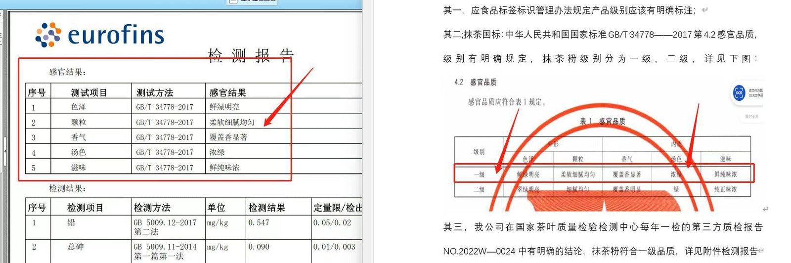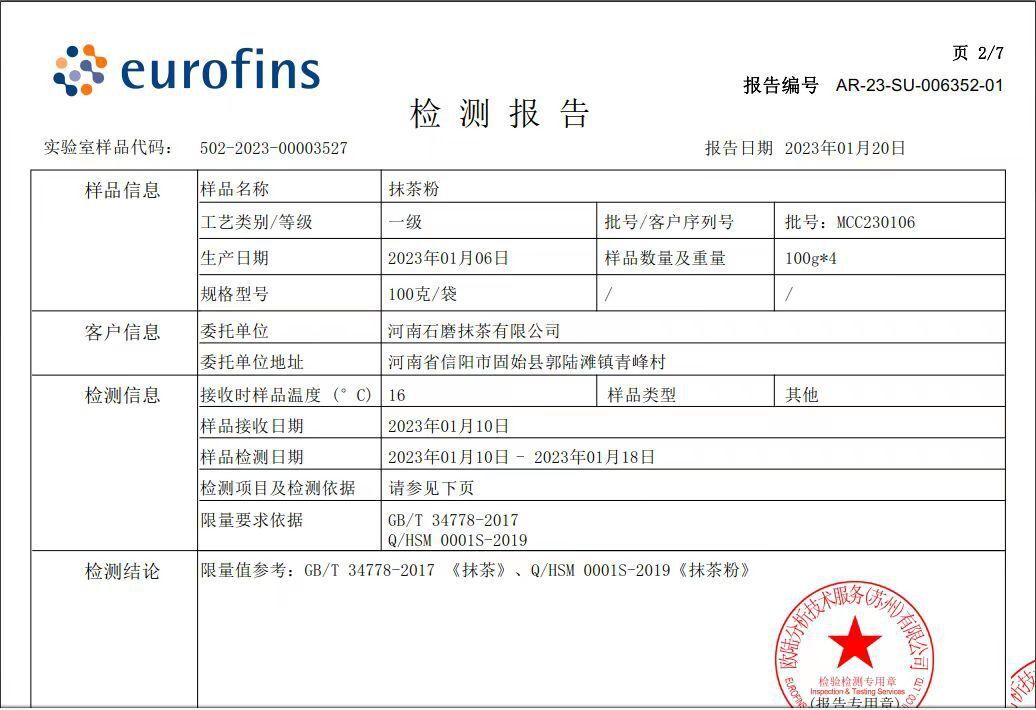 Third, the matcha products represented by our companyThe third-party quality inspection report at the National Tea Quality Inspection and Testing CenterNOThere is a clear conclusion in .2022W-0024 that the matcha powder meets the first-class quality, see the attached test report for details.