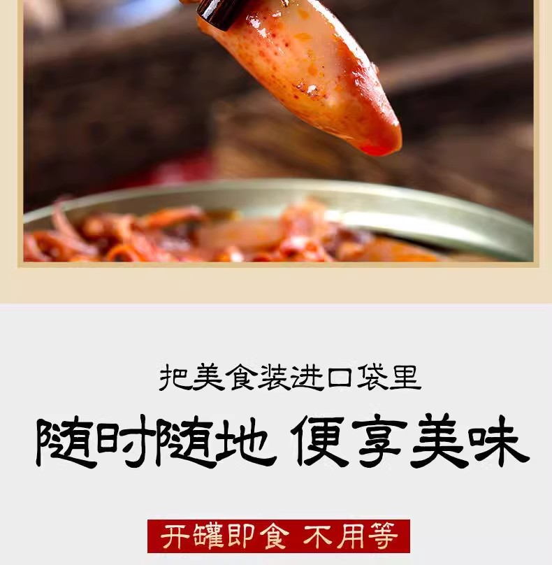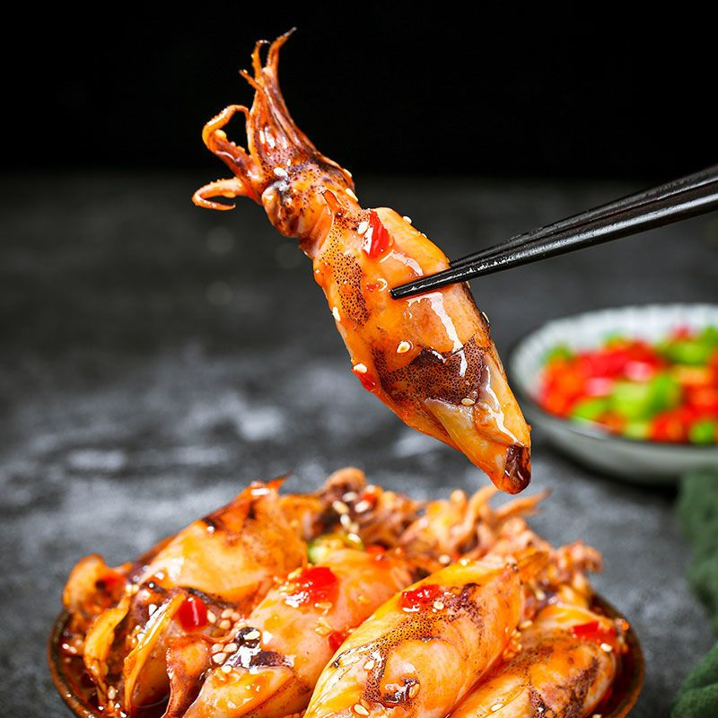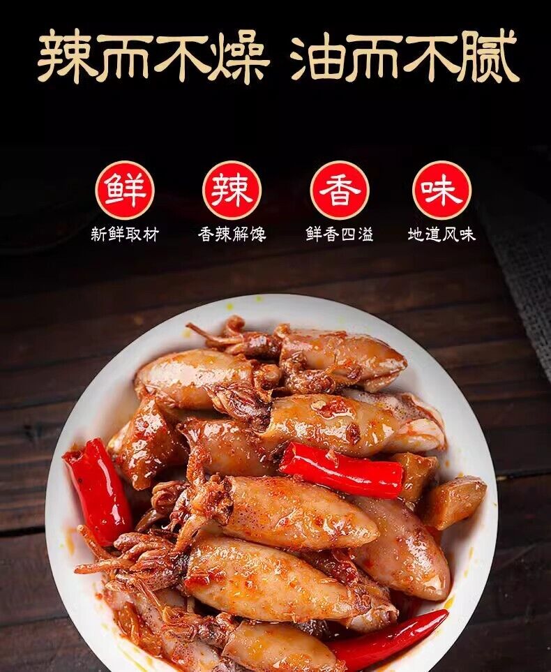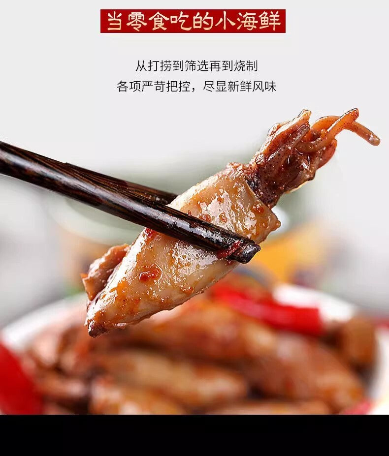 Spicy ready-to-eat seafood snack: baby octopus and octopus in glass