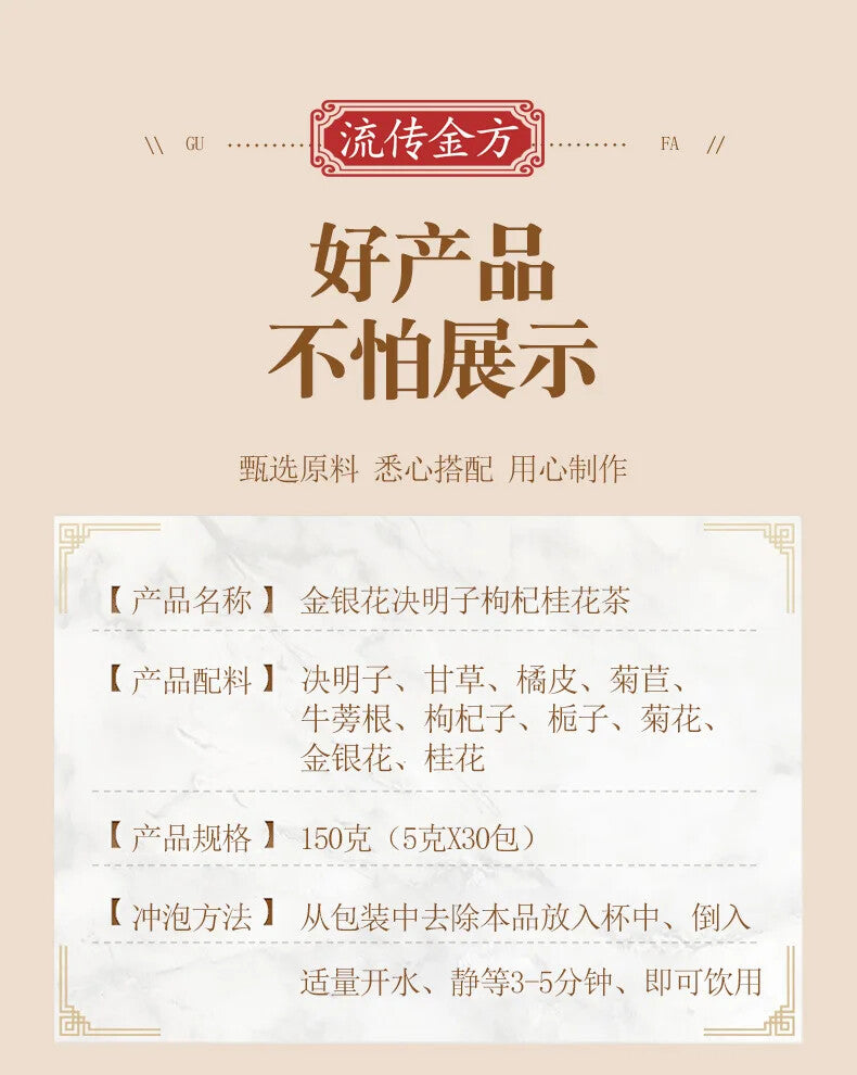 Honeysuckle Cassia Seed Wolfberry osmanthus tea 30 bags of tea Chrysanthemum Cassia seed tea chrysanthemum Wolfberry tea Product Description By the way, if you like our store, Please add our store to your Favorite Stores, You can get our New arrival and Discount information in time.     ...