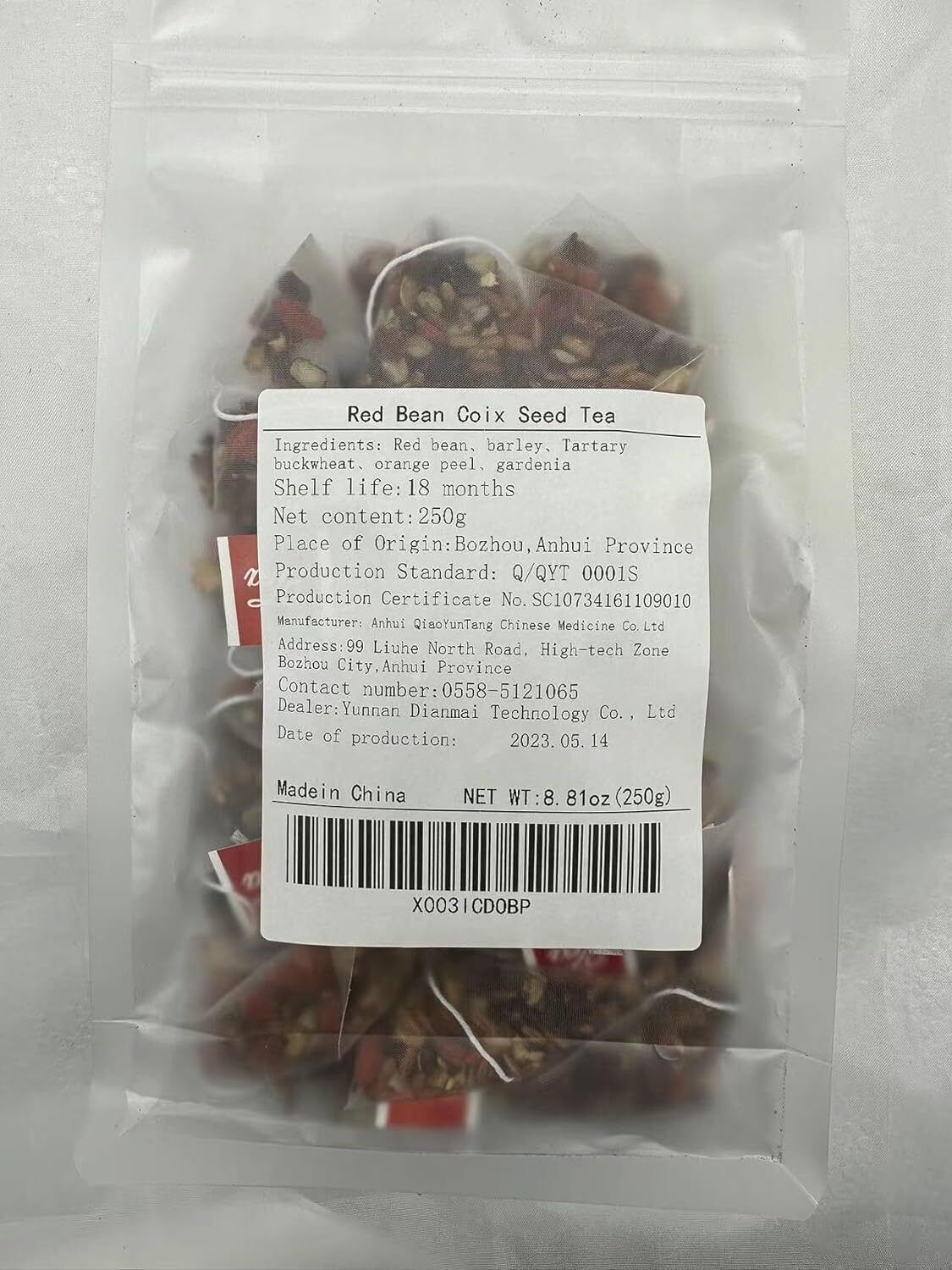 Red bean barley tea is an anti-dampness and health drink made of natural raw materials such as adzuki bean, barley seed, Poria cocos,Euryale seed and so on. Drinking Red bean barley tea helps to clear heat and dampness, which is more suitable for people with heavier dampness in the body, also good for the spleen and stomach. Independent small bag packaging, one pack at a time, high-quality pure natural tea bags allow you to enjoy the healthy taste of natural grains. The tea soup is clear and translucent,, the taste is fragrant, and the aftertaste is mellow. Drinking a cup of Red bean barley tea every day will improve your complexion. It is more suitable for sedentary, lack of exercise, and busy office workers. Red bean barley tea can remove moisture from the body, relieve greasiness and heat, and is said to calm people's irritable mood. Brewing method: Take a bag of this product in a cup, pour 250ml of hot water above 90℃, wait for 5-8 minutes to drink .Please note that the date on the package is the date of production. Shelf life: 18 months. Storage method: please put it in a cool and dry place and keep it away from light.