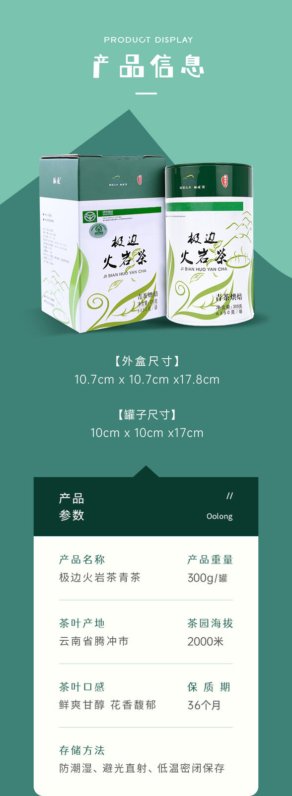 "Huo Yan Cha Qing Cha" Yunnan organic high-mountain oolong Tea Price for 300g/Tin Production Date: This year Shelf Life: 36 months Net Weight: 300g ,(6 bags x 50g). Tea Origin: TENG CHONG, Yunnan, China
