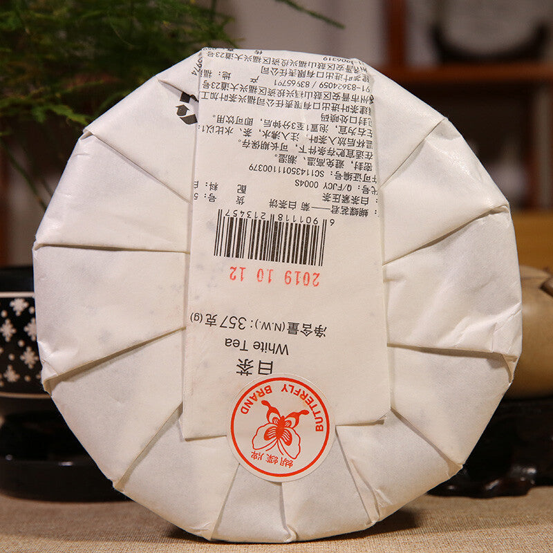 Product Name: Hu Die Ming Jun — Ju White Tea Cake Production date: 2019 Storage time: It can be stored for a long time under suitable conditions Food production license number: SC11435011100379 Net weight: 357g / Pc Origin: Fujian, China Factory: Fuxing Tea Factory Storage: Ventilation, cool, dry, no odor, long-term preservation in a pollution-free environment. Raw materials: White...
