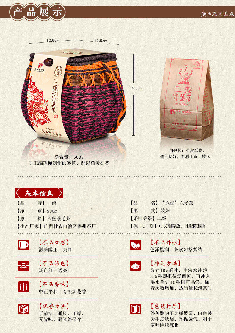 Type: Black Packaging: Basket Origin: China Net Weight: 500g Description: Liubao tea production in the Guangxi Zhuang Autonomous Region in northwest Liubao Cangwu County mountains. Cangwu County, situated between the Tropic of Cancer (latitude 23 ° 27 '), strong solar radiation, high temperature, rainfall Fung, average temperature 21.2 ° C...