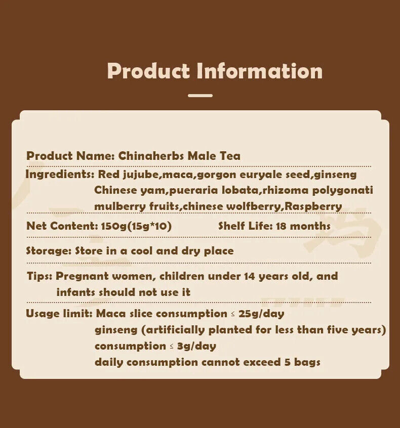 Storage Type:Store in a cool and dry place Specification:150g(15g*10teabags) Product Type:FLAVORED TEA Manufacturer:150g(15g*10teabags) Ingredients:no, Ginseng Maca rhizoma polygonati Chinese wolfberry and etc Content:man vitality tea Address:Bozhou Anhui Instruction for use:Hot water brewing Type:Herbal Tea Variety:Blended Style:Bagged Tea Processing Type:Blended, dried Specialty:Health Tea Packaging:Bag, Box, Bulk Grade:High Grade Shelf Life:18Months Weight...