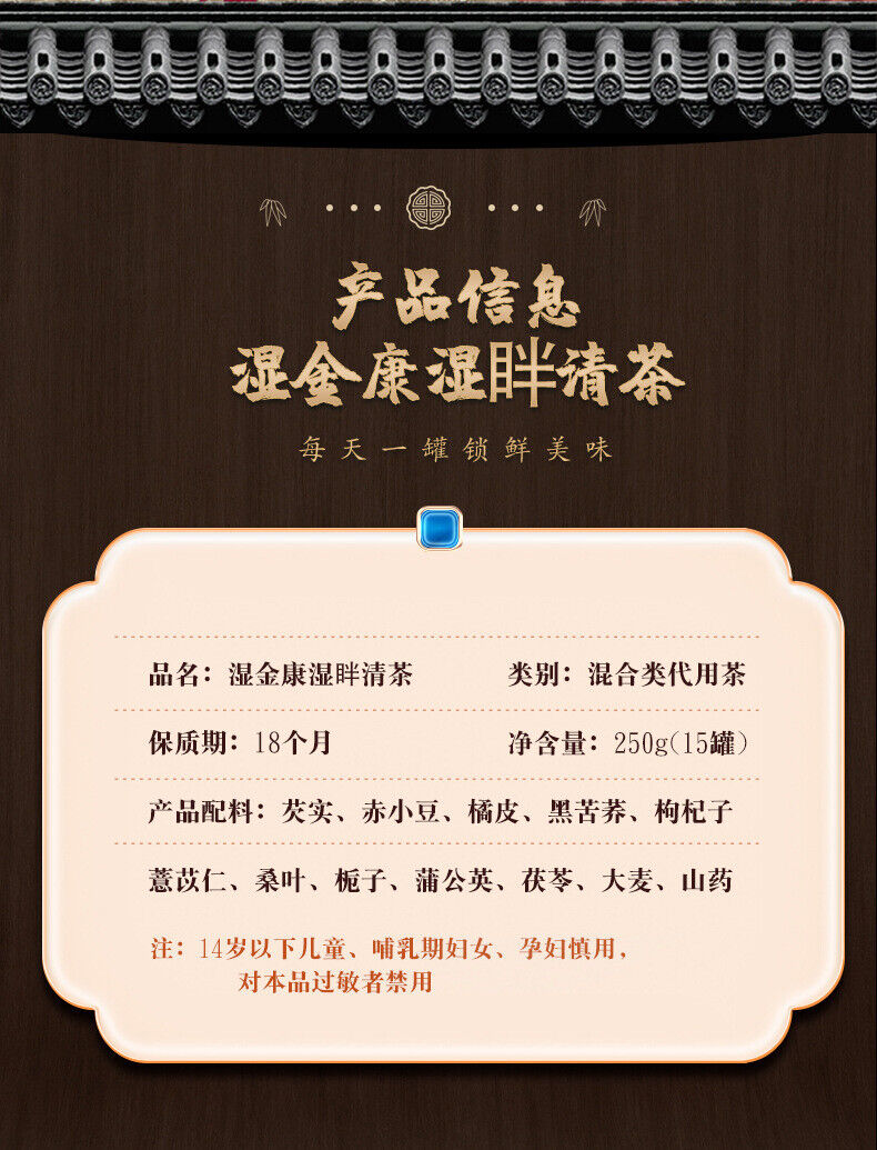 品牌:流传金方 货号:fggt32 售卖方式:包装 原料与配料:详见外包装 产品认证:否 保质期:18个月 原产地:安徽 储藏方法:冷藏 食品工艺:冷萃 是否礼盒装:否 生产日期:详见外包装 生产厂家:安徽流传金方健康产业有限公司 生产许可证编号:SC11434160230498 包装规格:流传金方湿金康湿眫清茶(小罐装250克) 净含量(规格):250克 是否含糖:无糖 箱规:30盒/箱 是否进口:否 茶种类:代用茶