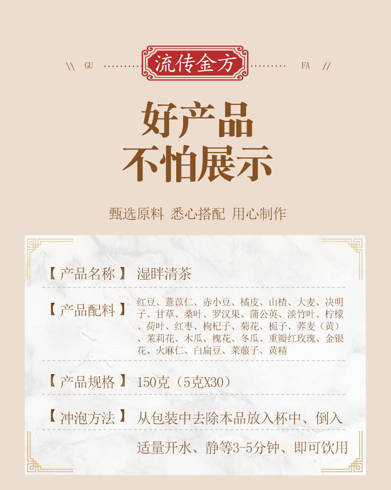 箱柜:100盒 产品认证:否 原产地:安徽 产品标准号:详见外包装 储藏方法:密封 包装规格:流传金方湿眫清茶(盒装袋泡茶) 是否为预包装食品:是 商品条形码:详见外包装 净含量(规格):150 是否含糖:无糖 品牌:流传金方 货号:453435 适用场景:商用 售卖方式:包装 热卖月份:全年 原料与配料:红豆,薏苡仁,桑叶,赤小豆,橘皮,山楂,大麦,决明子,甘草,淡竹叶,蒲共英,罗汉果 储存条件:常温 保质期:12个月以上 净度:99 食品工艺:冷泡 是否礼盒装:否 生产日期:持续更新 生产厂家:安徽流传金方健康产业有限公司 生产许可证编号:SC11434160230498 是否进口:否 茶种类:养生茶
