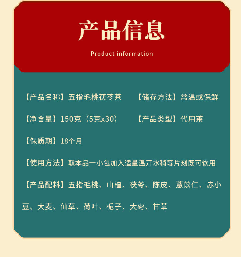 品牌:六和乾坤 货号:4641654 售卖方式:包装 原料与配料:详见外包装 产品认证:否 保质期:12个月以上 原产地:安徽 储藏方法:阴凉干燥 食品工艺:冷泡 是否礼盒装:否 生产日期:持续更新 生产厂家:安徽流传金方健康产业有限公司 生产许可证编号:SC11434160230498 包装规格:南京同仁堂六和乾坤五指毛桃茯苓茶(150克袋泡茶) 净含量(规格):150 是否含糖:无糖 箱规:100盒/箱 是否进口:否 茶种类:养生茶