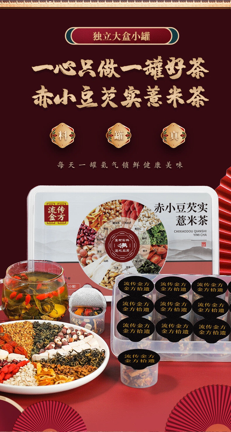 品牌:流传金方 货号:dsfs5 售卖方式:包装 原料与配料:详见外包装 产品认证:否 保质期:12个月以上 原产地:安徽 储藏方法:阴凉干燥 食品工艺:冷泡 是否礼盒装:否 生产日期:详见外包装 生产厂家:安徽流传金方健康产业有限公司 生产许可证编号:SC11434160230498 包装规格:流传金方赤小豆芡实薏米茶(250克15小罐) 净含量(规格):250克 是否含糖:无糖 是否进口:否 茶种类:养生茶