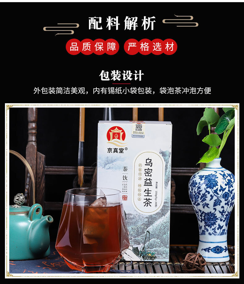产品认证:否 原产地:中国 产品标准号:Q/BJT 0002S-2020 储藏方法:防潮防虫 包装规格:5g*30包 内包装:袋装 是否为预包装食品:是 商品条形码:见包装 净含量(规格):150 品牌:京真堂 货号:乌密益生茶2 适用场景:家用 售卖方式:包装 热卖月份:全年 原料与配料:黑豆,黑芝麻,桑椹,枸杞子,人参,麦芽,茯苓,山药,大枣,干姜 储存条件:常温 保质期:12个月以上 净度:99 外包装:纸袋 是否礼盒装:否 生产日期:随时更新 生产厂家:亳州亳家堂生物科技有限公司 生产许可证编号:SC11434161107379 是否进口:否 茶种类:袋泡茶
