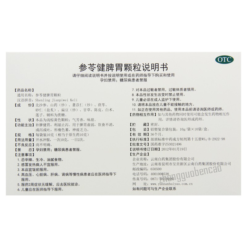 云南白药参苓健脾胃颗粒 每盒10袋 1盒装 保质期36个月 Item: Ynby Shenling Jianpiwei Keli Quantity/Box: 10 Bags Shelf Life: 36 Months Package Included: 1 Box of Ynby Shenling Jianpiwei Keli |