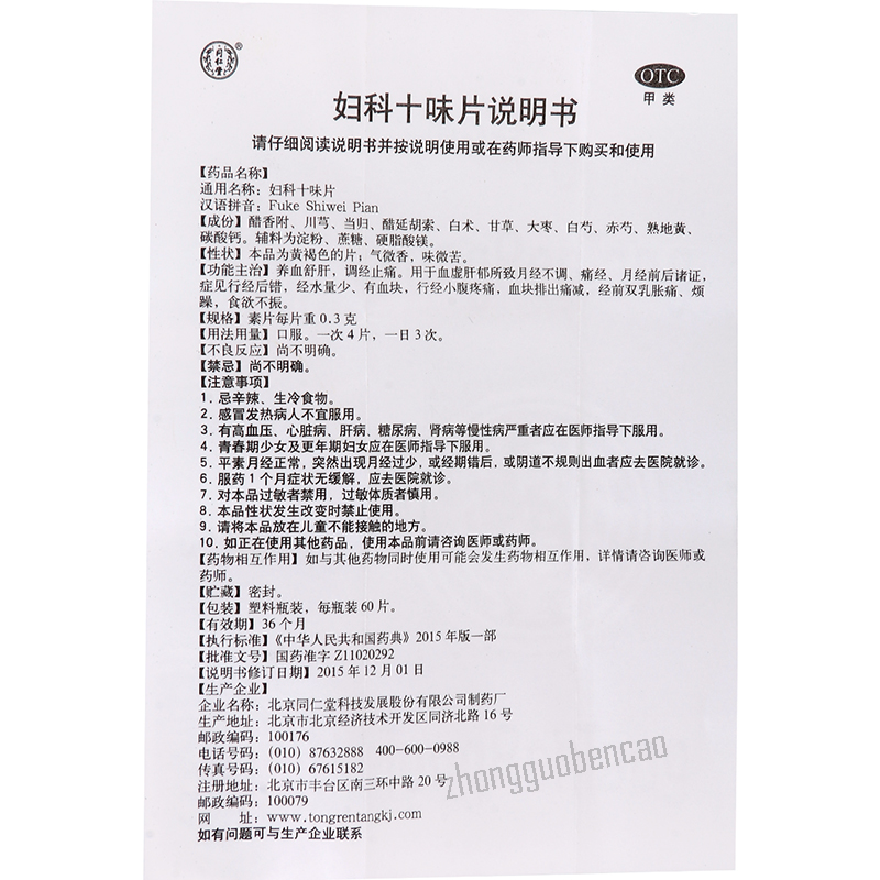 同仁堂妇科十味片 每盒60片 1盒装 保质期36个月 Item: Tongrentang Fuke Shiwei Pian Quantity/Box: 60 Tablets Shelf Life: 36 Months Package Included: 1 Box of Tongrentang Fuke Shiwei Pian