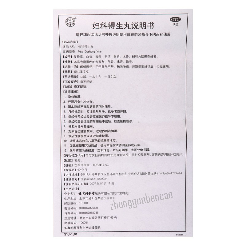 Tongrentang Fuke Desheng Wan同仁堂妇科得生丸