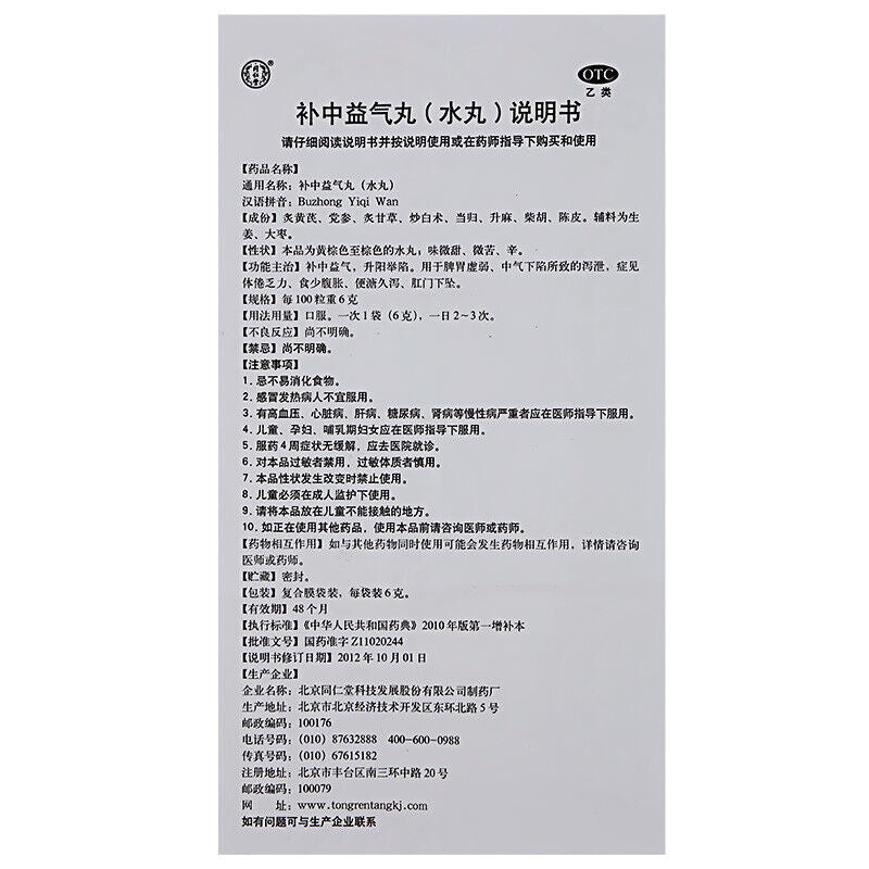 Tongrentang Bu Zhong Yi Qi Wan Tongrentang Buzhongyiqiwan 1Box同仁堂补中益气丸 1盒