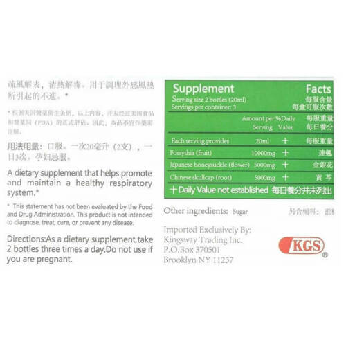 3 Boxes Honeysuckle & Skullcap Combo Shuang Huang Lian Kou Fu Ye (6 Vials), Total 18 Vials Indications: A dietary supplement that helps promote and maintain a healthy respiratory system. Directions: As a herbal dietary supplement, take 2 bottles, 3 times a day. Same product, two packaging options, shipped randomly.