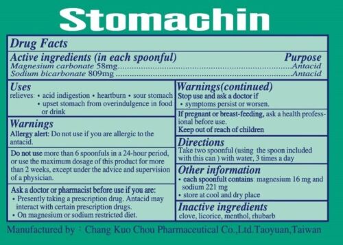 Stomachin Herbal Antacid Powder Large Can (15.9 Oz) Stomachin is an all-natural herbal supplement that supports the gastrointestinal tract and promotes health. As an antacid powder, it eases stomach acids, digests enzymes, and strengthens the digestive and metabolic functions. This herbal wonder also provides fast relief for poor appetite, indigestion, excessive acid, bloating, and thirst from drunkenness and vomiting. Uses: relieves acid indigestion, heartburn, sour stomach, upset stomach from overindulgence in food or drink Directions: Adults take 2 spoonful (2.0g) with water each time, 3 times daily. |