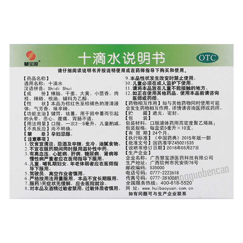 慧宝源十滴水 每盒10支 1盒装 保质期24个月 Item: Huibaoyuan Shidi Shui Quantity/Box: 10 Bottles Shelf Life: 24 Months Package Included: 1 Box of Huibaoyuan Shidi Shui