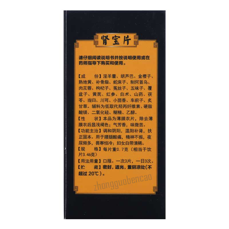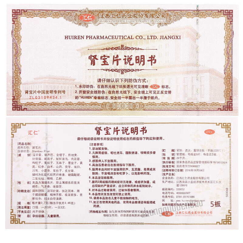 汇仁肾宝片 每盒45片 1盒装 保质期24个月 Item: Huiren Shenbao Pian Quantity/Box: 45 Tablets Shelf Life: 24 Months Package Included: 1 Box of Huiren Shenbao Pian |