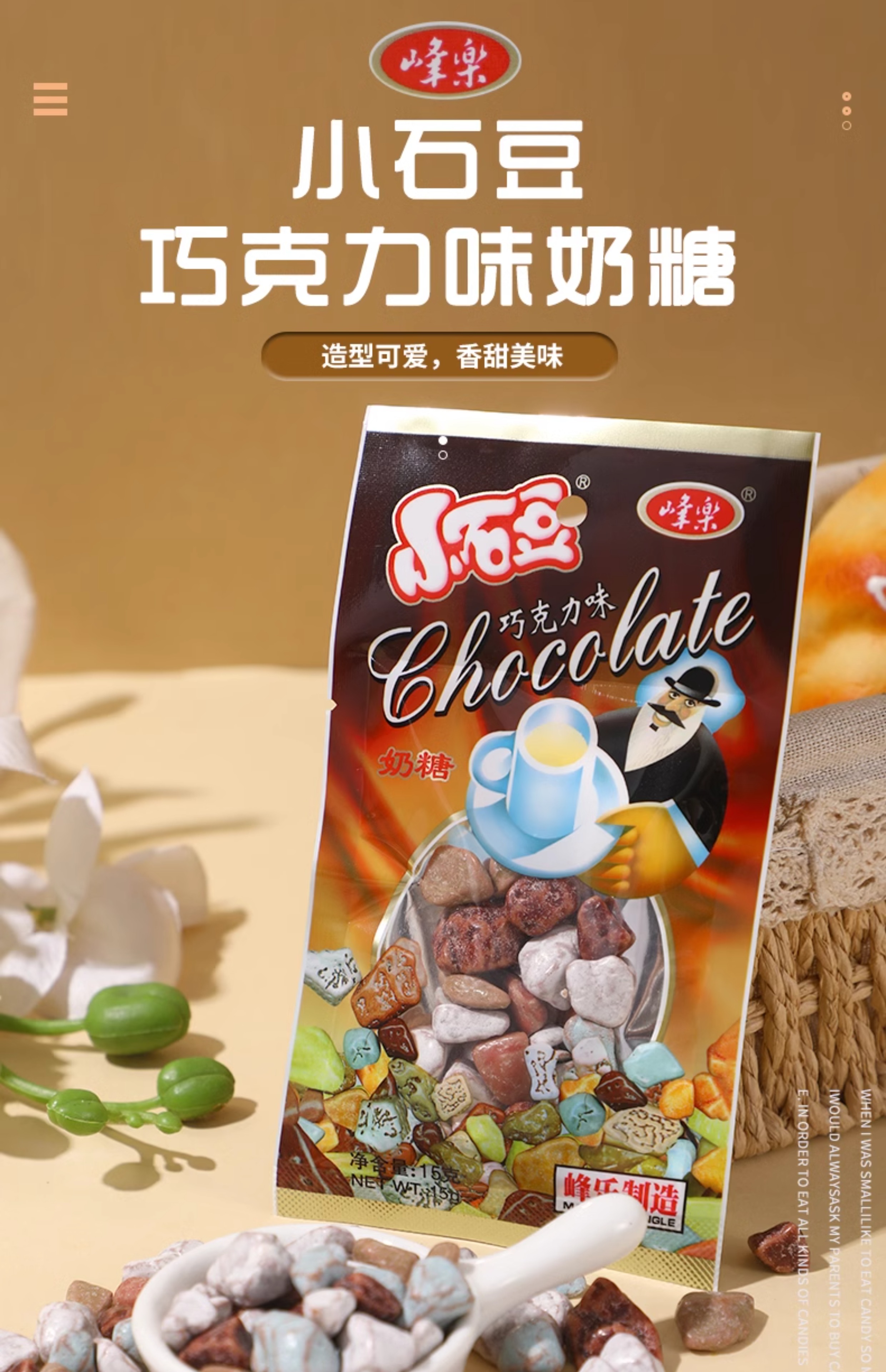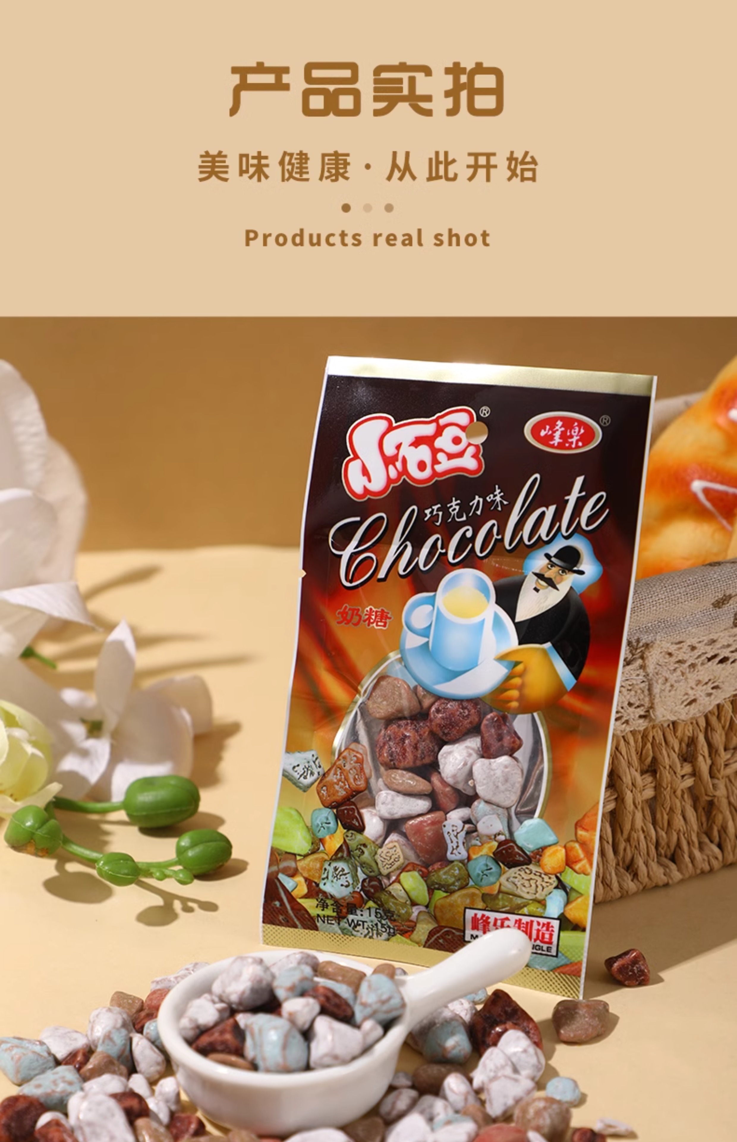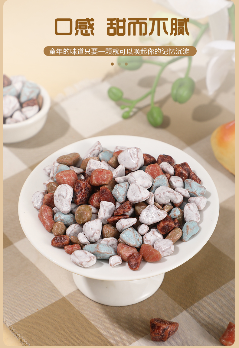 Ingredients: white sugar, malt syrup, cocoa cube, etc Storage method: Store in a cool and dry place, pay attention to moisture after opening Shelf life: 360 days Place of Origin: China Organic food: No Net content: 15g/ bag Storage condition: room temperature Name: Small stone bean chocolate creamy candy