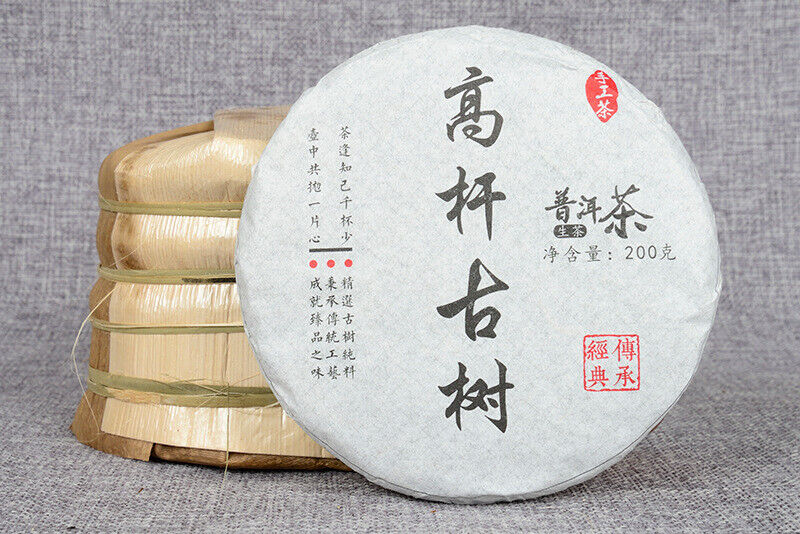 【产品名称】:200g高杆古树生饼 【产品原料】:云南大叶种晒青古树茶 明前春茶 【生产工艺】:普洱生茶     【净含量】:200克/饼   5饼/提   30饼/件 【生产日期】:2018年10月22日 【贮存条件】:清洁、通风、干燥、无异味、避免阳光直射 【保 存 期】:在贮存条件下适宜长期存放       一款好的普洱茶,不仅仅体现在他的外形,内在更重要   200g高杆古树生饼,古法制作,石磨压制,松紧适度,利于后期转化   入口绵柔,如蜜香甜,回甘生津,滋味饱满而回味   芽叶细嫩,脉络清晰,叶底厚实 而饱满