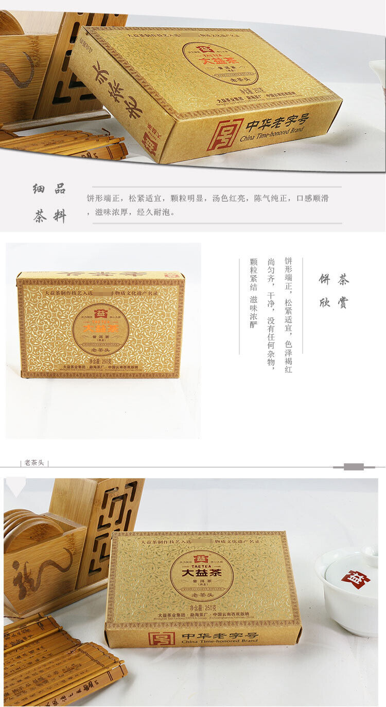 Pu Erh LaoChaTou Menghai Dayi Puer Tea Brick 250g Ripe/Cooked Tea Type: Ripe tea Net weight: 250g/pc, Price for one pc ONLY. Production Date: (201 batch) Origin: Menghai,Yunnan,China Manufacturer: Menghai Tea factory,TAETEA Group. Lao Cha Tou is formed during the fermentation process. The leaves under heat and pressure will clump together at...