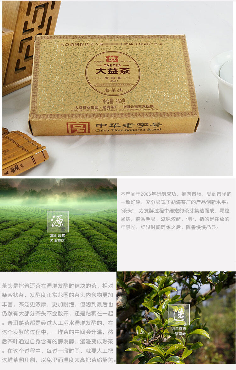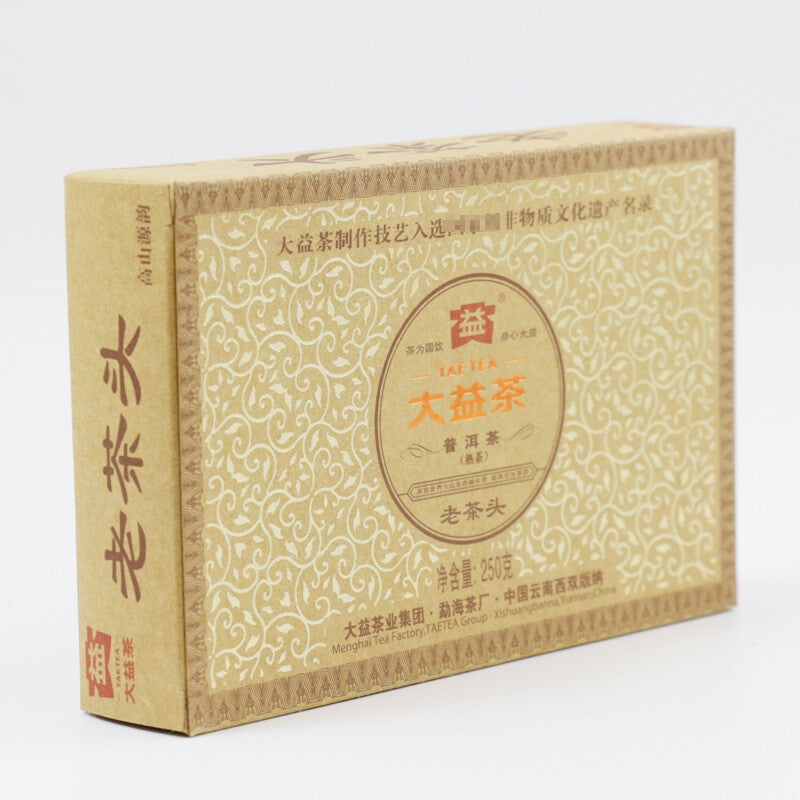 Pu Erh LaoChaTou Menghai Dayi Puer Tea Brick 250g Ripe/Cooked Tea Type: Ripe tea Net weight: 250g/pc, Price for one pc ONLY. Production Date: (201 batch) Origin: Menghai,Yunnan,China Manufacturer: Menghai Tea factory,TAETEA Group. Lao Cha Tou is formed during the fermentation process. The leaves under heat and pressure will clump together at the bottom of the pile and form nuggets. Cha Tou are little tea nuggets that are a wonderful byproduct of the fermentation process of Pu-Erh tea. This tea can be infused over 15 times easily.