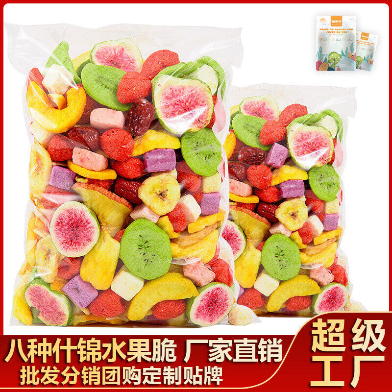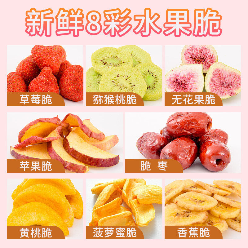 Raw materials and ingredients: strawberry crisp, fig crisp, yellow peach crisp, banana slices, kiwi crisp, crisp dates, freeze-dried yogurt, jackfruit crisp, apple crisp